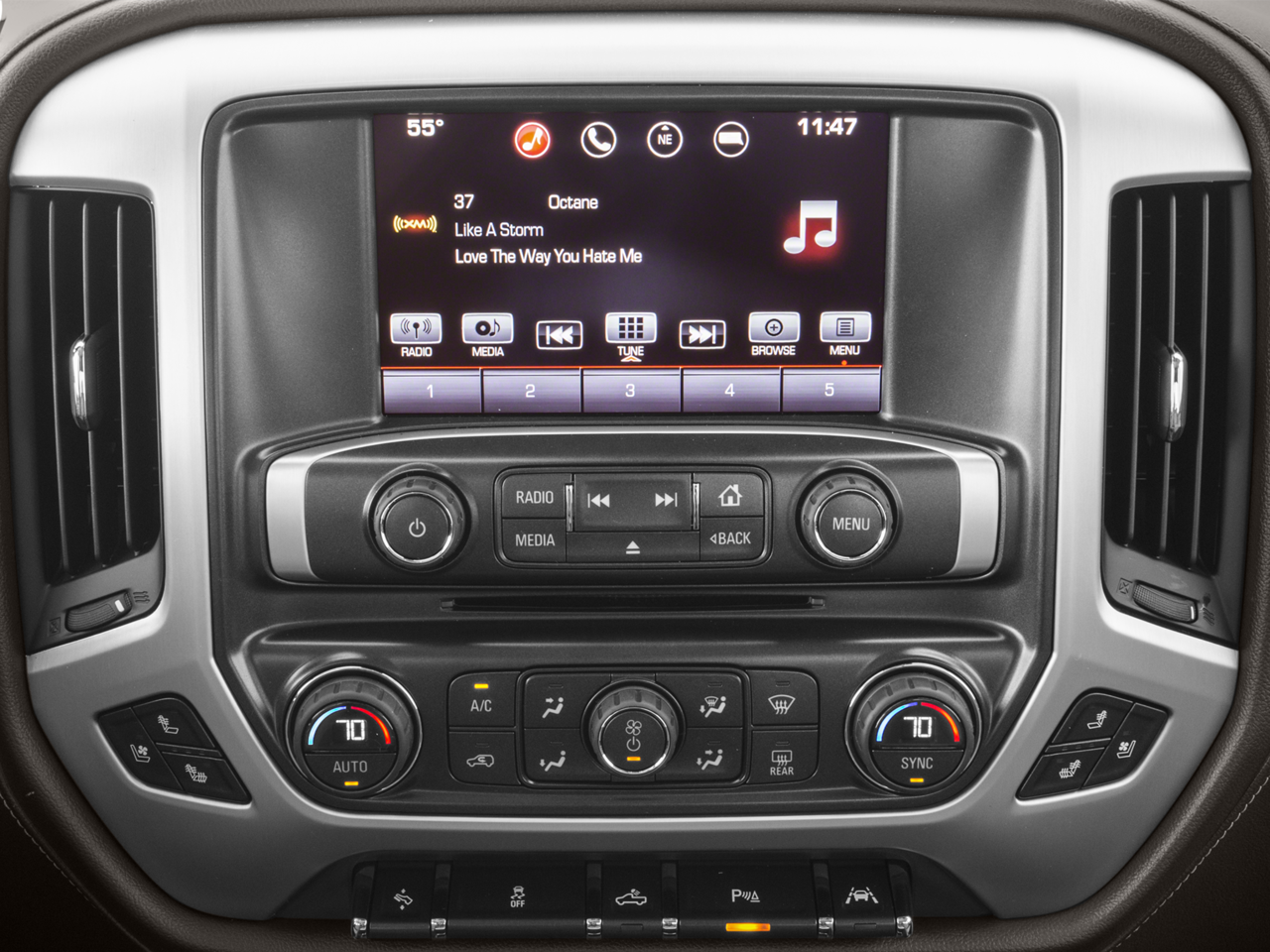 Enhanced Driver Alert Package: Lane Keep Assist; Forward Collision Alert; Low Speed Forward Automatic Braking; Ultrasonic Front and Rear Park Assist; IntelliBeam Automatic High Beam On/off Headlight. SLT Crew Cab Premium Plus Package: Leather Wrapped Heated Steering Wheel; Bose Speaker System; 20" X 9" Chrome Clad Aluminum Wheels; Power Sliding Rear Window with Defogger; Front Full Feature Power Reclining Bucket Seats; Spray-On Pickup Box Bed Liner with GMC Logo; High-Performance LED Headlamps; Integrated Trailer Brake Controller; AM/FM Stereo with 8" Diagonal Color Touch Navigation; Heated and Ventilated Front Bucket Seats; 6" Rectangular Chromed Tubular Assist Steps. Preferred Equipment Group 4SA: LED Cargo Box Lighting; EZ Lift and Lower Tailgate; Chrome Door Handles; Rear Vision Camera; Rear 60/40 Folding Bench Seat (folds Up); Remote Vehicle Starter System; 5.3L EcoTec3 V8 Engine; Electric Rear Window Defogger; Theft Deterrent System (unauthorized Entry); Auxiliary External Transmission Oil Cooler; 4.2" Diagonal Color Display Driver Info Center; Trailering Equipment; 110-Volt AC Power Outlet; Thin Profile LED Fog Lamps; 150 Amp Alternator; Steering Wheel Audio Cont