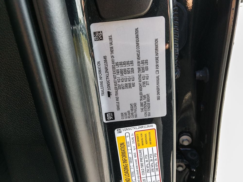 Max Trailering Package: Extra Capacity Cooling System. Advanced Trailering Package: Trailer Side Blind Zone Alert; Smart Trailer Integration Indicator; Integrated Trailer Brake Controller; Hitch Guidance with Hitch View. High Country Deluxe: Dual-Pane Power Panoramic Sunroof; Air Ride Adaptive Suspension; Power-Retractable Assist Steps; Adaptive Cruise Control. Preferred Equipment Group 3LZ: Bright Front and Rear Door Sill Plates; Memory Settings; Stop/start System Disable Button; Perforated Leather Seat Trim; Remote Start; 3rd Row 60/40 Power-Folding Split-Bench Seat; Safety Alert Seat; Chrome Door Handles with Body-Color Strip; 6.2L EcoTec3 V8 Engine; Rear Camera Mirror Washer; Inside Rearview Auo-Dimming Rear Camera Mirror; Heated Steering Wheel; LED Daytime Running Lamps; Rear Cross Traffic Alert; Wheels: 22" X 9" Sterling Silver Premium Painted; Driver and Front Outboard Passenger Airbags; Wireless Charging; Front High-Back Reclining Bucket Seats; Universal Home Remote; Color-Keyed Carpeting Floor Covering; Heated 2nd Row Outboard Seats; Hands-Free Rear Power Programmable Liftgate; Chevrole